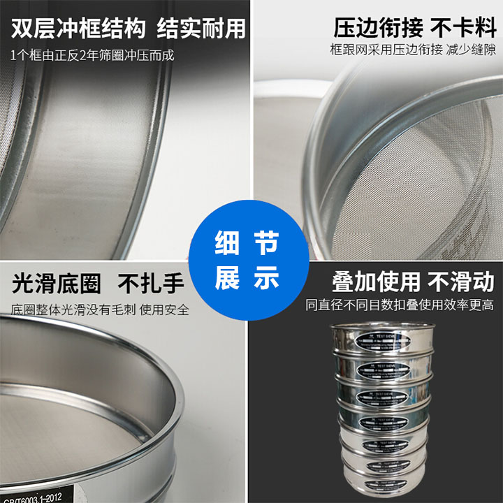 2、篩框采用SUS304(0Cr18ni9)不銹鋼拉伸拋光而成,壁厚0.6-0.7毫米,表面光可鑒人,整體成型堅(jiān)固耐用,沒有磁性,篩網(wǎng)與篩框通過錫焊固定,不會(huì)松弛。能耐300度以下高溫。